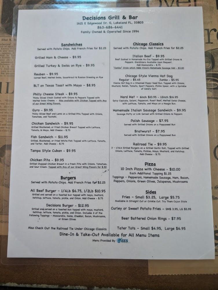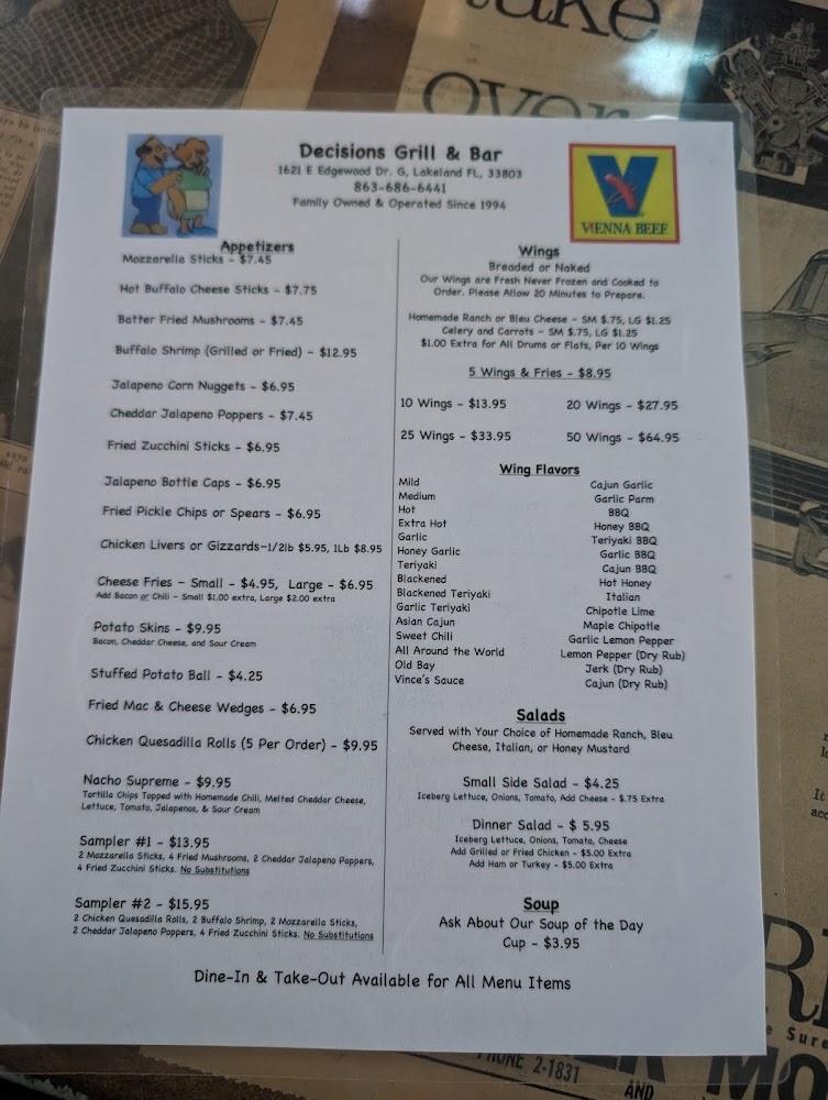 Decisions Grill & Bar features a diverse menu filled with comfort food. The star attraction is undoubtedly the wings, available in several flavors. Appetizers like mozzarella sticks and buffalo shrimp kick off a satisfying meal. Burgers, gyros, and a range of sandwiches like the Philly cheesesteak are fan favorites. There's also a kids' menu and vegetarian options, ensuring something for everyone. The homemade Chicago hotdogs and Italian sausage connect visitors with authentic flavor, making it a true destination for food lovers.