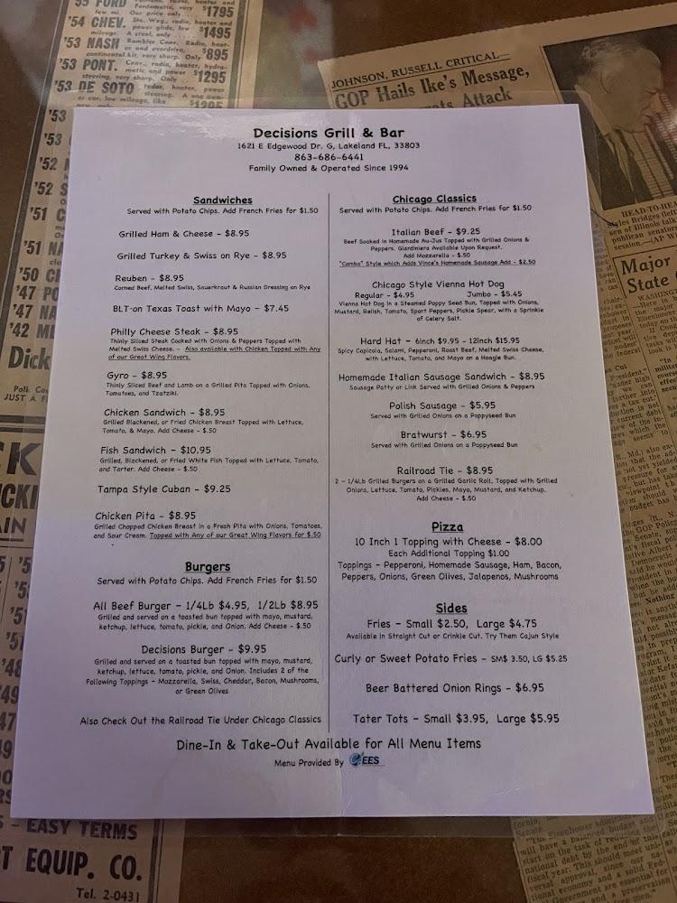 Welcome to Decisions Grill & Bar, where we serve the best wings in town alongside a mouth-watering selection of fresh burgers, gyros, and Chicago favorites like Italian beef and Vienna hotdogs. Established in 1994, our family-owned restaurant offers a welcoming atmosphere perfect for sports fans and families alike. Enjoy a cold beer or wine while playing pool, darts, or poker with friends. With great takeout options and a spacious patio, we’re your go-to spot for lunch, dinner, or a casual night out. Come experience our commitment to delicious food and exceptional service!